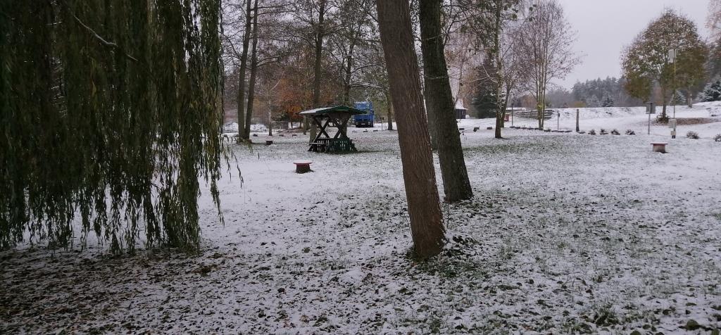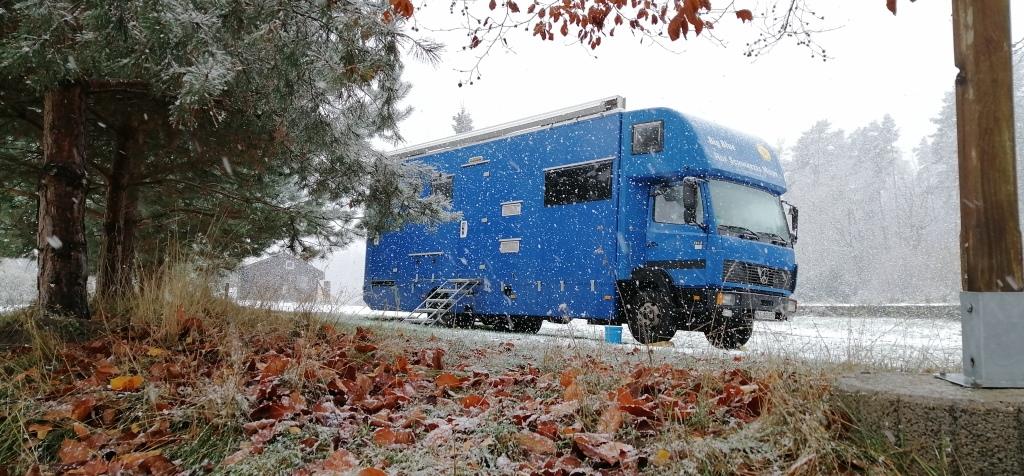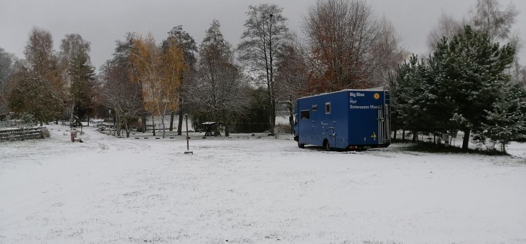 Und was Wunder. Es ist nicht nur geöffnet, nein auch die Rezeption ist besetzt. So ist der CheckIn schnell bewerkstelligt und ich darf mir den Platz selbst aussuchen, den ich will. Allerdings ist das mit dem „Wollen und Wünschen“ dann doch sehr eingeschränkt. Die schönsten Plätze muss ich bergan und mit Fahrbahnverschränkungen anfahren. Und die meisten auch noch rückwärts. Und da ist dann ganz schnell Schluss bei dem herrschenden Schneetreiben. Die Hinterachse dreht immer wieder durch und rutscht weg. Trotz Differentialsperre und fast vollem Wassertank auf der Achse. So bleibt mir nur ein Platz übrig, den ich gefahrlos ansteuern kann und der auch so liegt, dass ich Hoffnung haben kann, dass ich da auch irgendwann mal wieder runterkomme.
