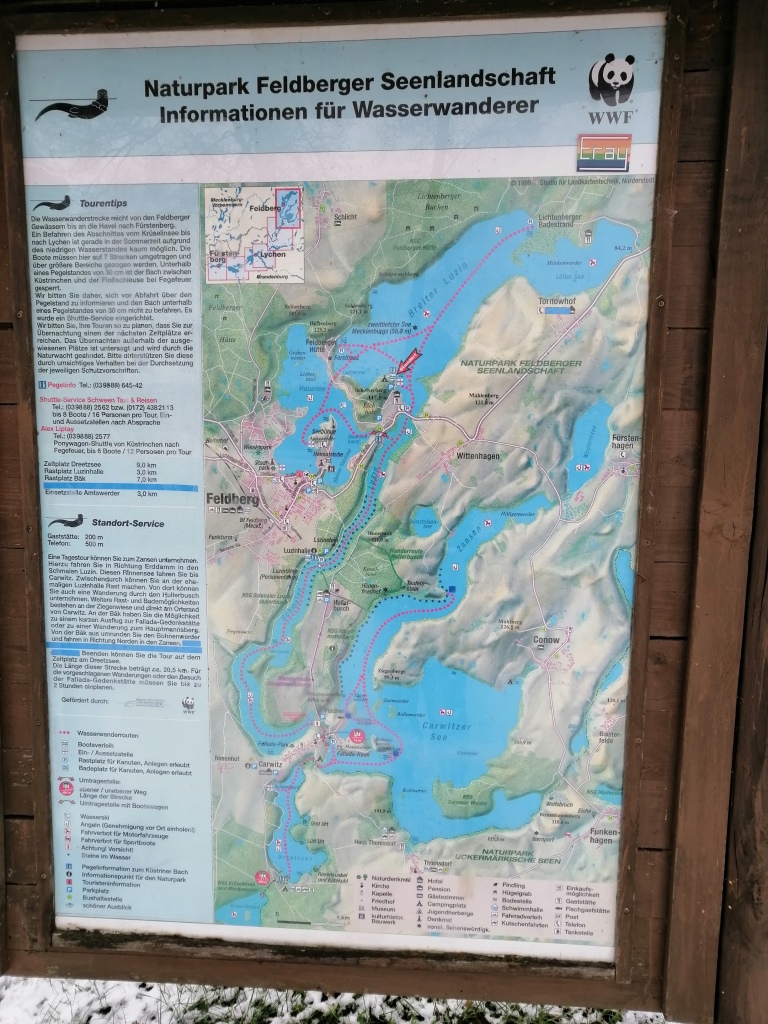 In dieser traumhaften Umgebung gehe ich zufällig zum „Schmalen Luzin See“. Ich komme an eine Stelle, an der ein kleiner Nachen als Fähre diesen überquert – in der Saison. Wie bei dem meisten, was ich auf meiner Tour hier auf der Seenplatte antreffe, hat auch hier die Winterpause zugeschlagen. Da ich auf Google Maps nachgesehen habe, wäre es eine tolle Möglichkeit, auf ganz kurzem Weg nach Feldberg überzusetzen. Und dort gibt es ein Lebensmittelgeschäft. Und ich bräuchte schon mal wieder ein paar Essensvorräte. Ein Anruf bei dem Fährmeister und dieser erklärte sich bereit, wenn ich am kommenden Tag gegen 12:00 Uhr an dem Fähranleger wäre, mich überzusetzen. Denn dann wäre er sowieso mal da um irgendwelche Arbeiten auszuführen. Toll.