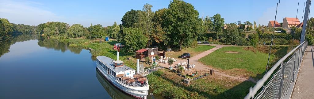 Heute starte ich die zweite Runde meiner September Bewegungsfahrt. Erstes Ziel wird das Treffen „Lange Nacht der Zugvögel“ sein. Da ich die restliche Woche Zeit habe, dort hin zu kommen, mache ich beim Café Saalekiez Zwischenpause. Da ich hier innerhalb der Woche aufschlage, hat das Café natürlich zu. Aber trotzdem treffe ich den Betreiber an und kann mit ihm mal wieder über das Leben im Allgemeinen und Besonderen klönen. Und Radfahren entlang der Saale. Aber zu Jörgs Firma „Georgsenf“ ist es mir dann doch mit dem Rad zu weit. So wasche ich mir den Schweiß von der Radtour auf dem Saaleradweg bei einem Bad in der Saale ab.
