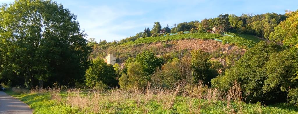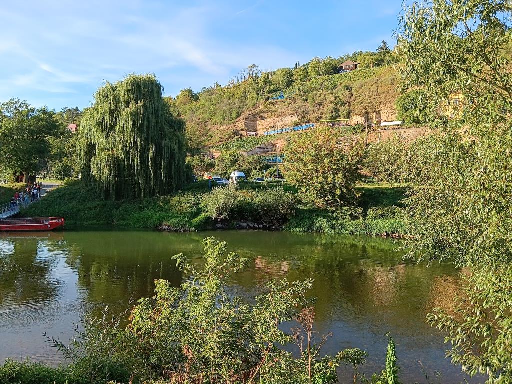 Endlich sehe ich auch mal die Weinberge an der Saale. Die erinnern mich an die Weinberge im Rheingau. Von vor 55 Jahren, als ich dort am Wochenende mit meinem Vater zu dem Winzer seines Vertrauens gefahren bin um nicht nur Wein zu kaufen. Nein, ich hatte auch damals schon den Eindruck, dass es vielmehr darum ging, per ausgiebiger Weinprobe im Blick zu behalten, wie sich der Wein entwickelt. Leider sehen die Weinberge im Rheingau heute ganz anders aus: großflächige Monokulturen für die industrielle Produktion. Hier bei Naumburg finde ich hauptsächlich kleine Weinberge, die auch in andere Kulturen eingefügt sind. So wie früher eben. Und es sieht so einfach schöner aus.