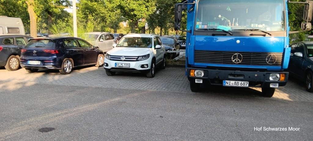Wie ich anschließend im Auto sitze und diese Zeilen tippe, fährt auf den Stellplatz (siehe Foto) ein weiteres – viertes – Wohnmobil. Durch bis zum Anschlag. Dann rangiert er solange, bis er andersherum steht und will den Platz wieder verlassen und touchiert dann Big Blue vorne links an der Stoßstange. Er steigt aus, begutachtet sein Auto, steigt ein und will weiterfahren. Als ich ihn stoppe und zur Rede stelle, sagt er doch zu mir, er hätte ja Angst gehabt, bei sich einen Schaden zu haben. Da er dort – bei sich – aber nichts erkennen konnte, ist er davon ausgegangen, dass er ohne 1) bei mir gucken und 2) ohne mich ansprechen zu müssen einfach davonfahren könnte. Da kann man nur fassungslos staunen. 1) Warum ist er den Platz nicht zu Fuß abgegangen und 2) warum versucht er dann Fahrerflucht zu begehen? Ich denke mal, er würde, wenn er bei uns auf den Platz käme, sich in der Reihe derjenigen einreihen, die am helllichten Tag vorwärts auf unserem sechs Meter breiten Weg in den Graben fahren würden. Und darüber hinaus nicht wüste, wo an seinem Auto die Abschleppöse ist. Warum dürfen solche Leute Auto fahren?