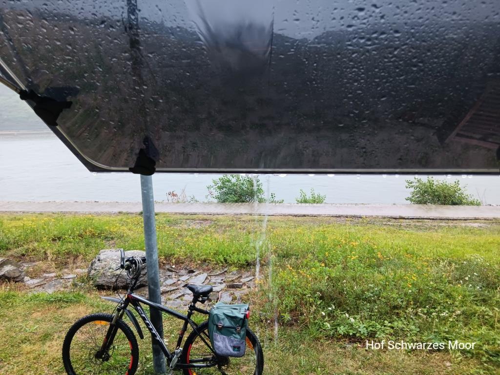 Schon direkt nach dem Frühstück bin ich reif für eine Badepause. Laut Wetterbericht liegt eine Nacht mit tropischen Temperaturen hinter mir: Beim ersten Aufwachen heute Morgen sind es schon – oder noch – 22°C. Und das Wetter schlägt wohl um. Westlich über dem Rhein hängen dunkle Wolken, östlich ist blauer Himmel mit kleinen Wölkchen zu sehen. Und ich mal wieder direkt an der Wetterscheide.