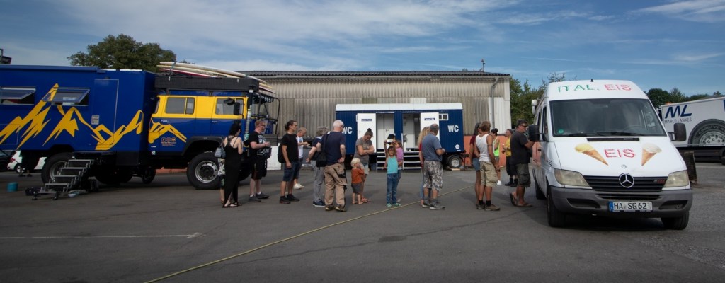 Auch heute lange geschlafen. Frühstück gegen 11:00 Uhr. Dann erste Runde über den Platz. Da auch heute das Programm erst gegen 15:00 Uhr losgeht, mal die ganzen Essstände angeguckt: Kichererbsen Curry, Pizza, Kuchen, Verschiedenes vom Weiderind und last but not least Eis und Crêpes, hergestellt aus hofeigenen Früchten und Zutaten. Dieser Stand findet meine besondere Beachtung. Wegen des absolut leckeren Eises! Und das Kichererbsen Curry.