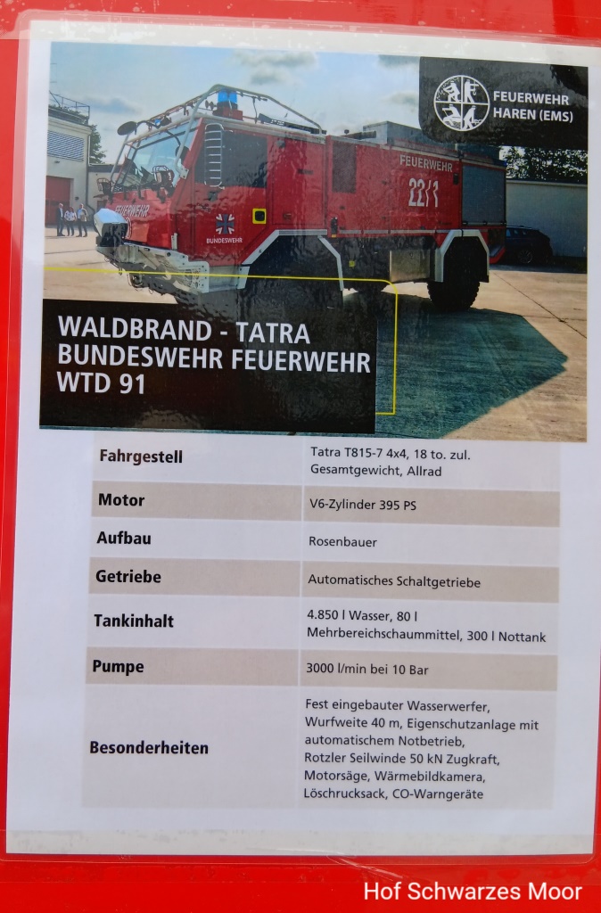 Bei der Technik fallen mir zwei Fahrzeuge der BW-Feuerwehr aus Meppen für die Moorbrandbekämpfung besonders auf: Ein zweiteiliges Kettenfahrzeug, hergestellt größtenteils in Singapur (!) und ein Tatra (!)-Großlöschfahrzeug. Soviel zur Unterstützung des heimischen Gewerbes durch unsere öffentlichen Einrichtungen und politischen Verantwortungsträger.