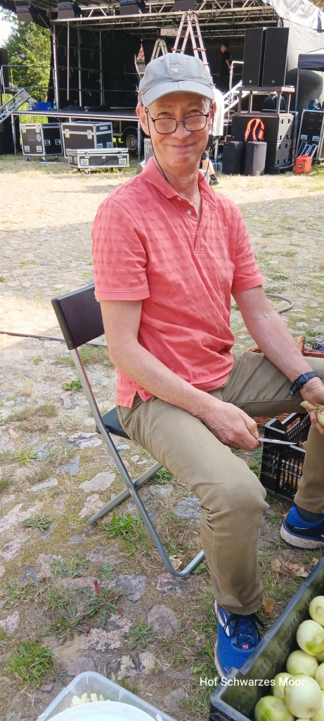 Nach meinem Frühstück gehe ich so gegen 12:00 Uhr auf den Festplatz. So lande ich wieder bei den GemüseputzernInnen. Die Küchenverantwortlichen haben über Nacht entschieden, dass das gestern vorbereitete Gemüse wohl nicht ausreichend für die zwei Tage ist. Heute wird die Arbeit schon mal auch mit Probeessen versüßt.