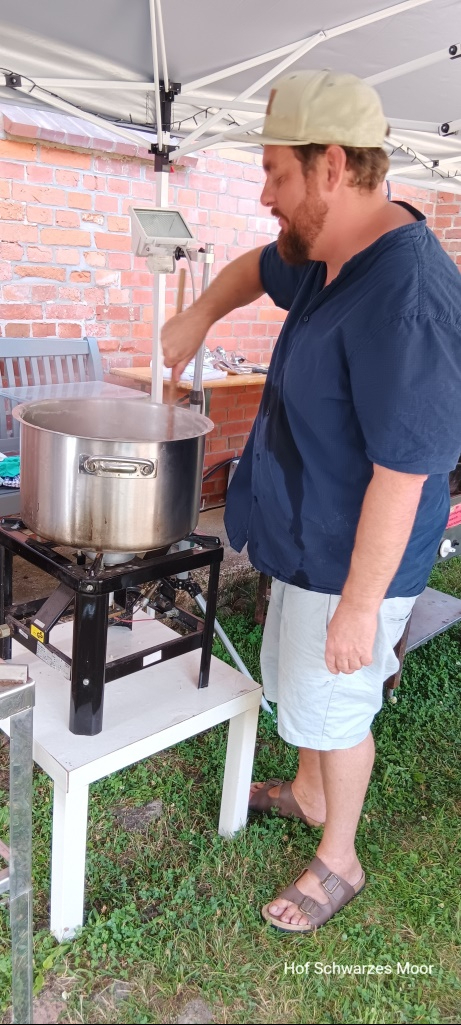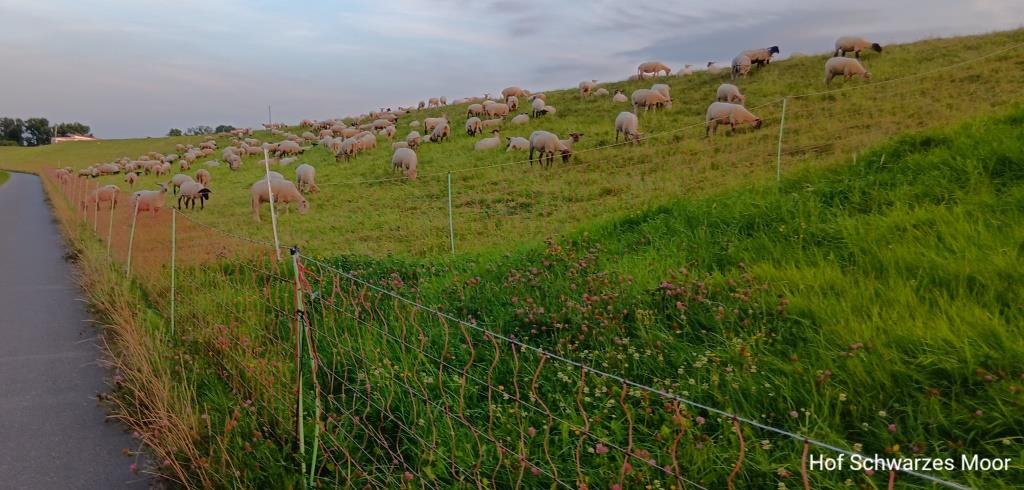 Dabei treffe ich noch Thomas (den Besitzer) und klöne mich mit ihm fest. Er hat schon auf unserer Homepage gestöbert und möchte ganz viel über Schafhaltung – insbesondere mit Heidschnucken – wissen. Irgendwann gesellt sich seine Frau dazu. Als dann noch die Bauarbeiter, die hier zurzeit Strom und Glasfaser in die Erde bringen und ein Nachbar an der geselligen Gesprächsrunde teilnehmen, mache ich mich auf den Weg.