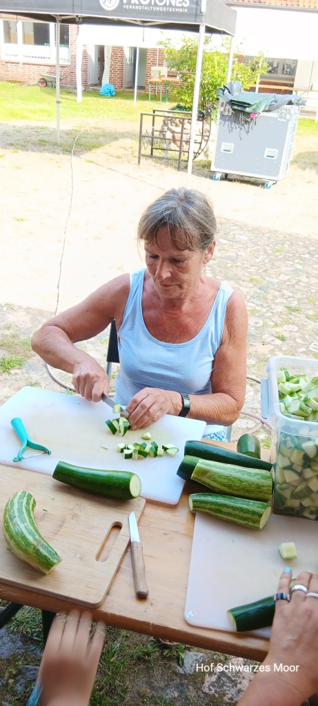 Nach entspannter Fahrt muss ich mich an der Einfahrt zum Anwesen hinter der LKW-Kolonne des Bühnenequipment Unternehmens einreihen. Aber schnell bekomme ich einen Stellplatz – eigentlich ist er für die Bewohner, die Künstler und Helfer vorgesehen – zugewiesen. Noch – heute ist ja Donnerstag und damit ein Tag vor Veranstaltungsbeginn – ist nicht viel los. Aufbau eben. Und viele Menschen, die Lebensmittel vorbereiten für die verschiedenen Essstände vorbereiten. Dort finde ich, nachdem ich mir das ganze Anwesen angeschaut habe und (erfolglos) versucht habe mit dem Fahrrad nach Dahlenburg zu fahren um dort meinen ganzen vergessenen Kram – Apfelsaft, Tee und Balsamico – einzukaufen, meine Beschäftigung für die nächsten Stunden: Zucchini, Mohrrüben, Zwiebeln, Knoblauch, Gurken und Kohl für ein großes Kichererbsen Curry schneiden.