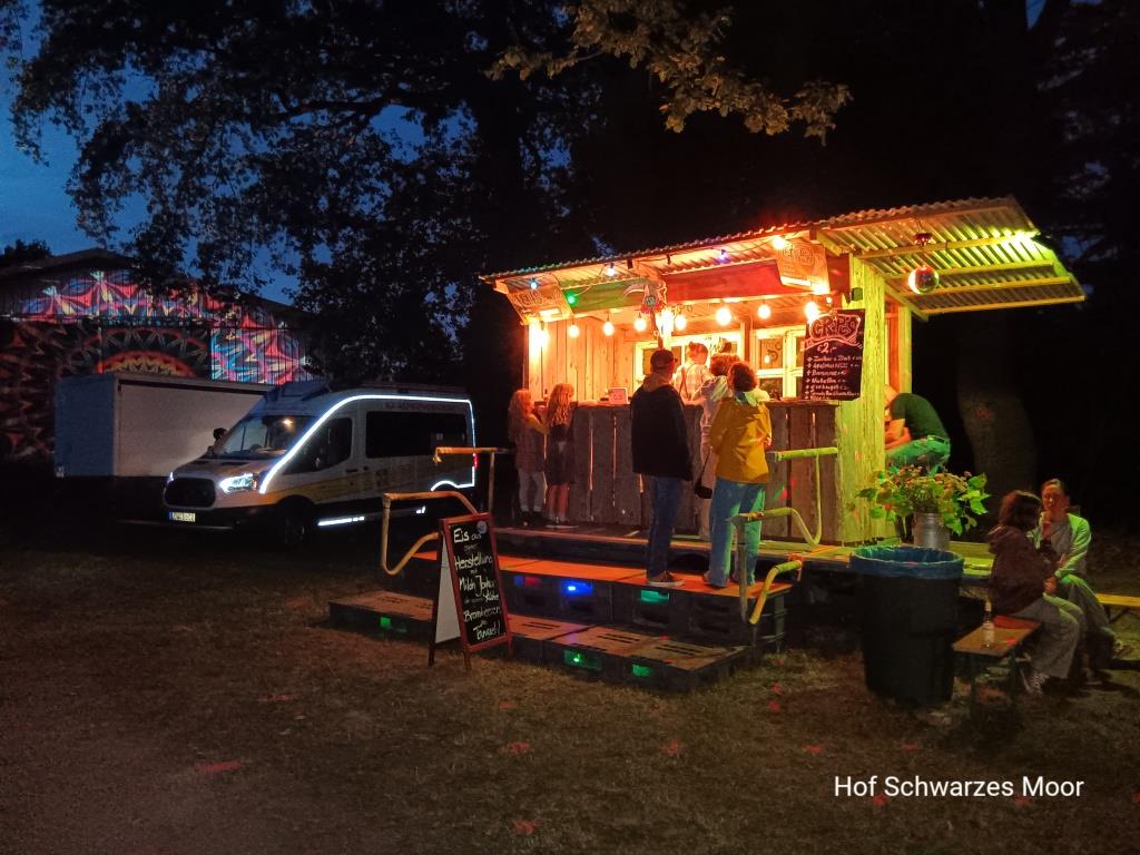 Auch heute lange geschlafen. Frühstück gegen 11:00 Uhr. Dann erste Runde über den Platz. Da auch heute das Programm erst gegen 15:00 Uhr losgeht, mal die ganzen Essstände angeguckt: Kichererbsen Curry, Pizza, Kuchen, Verschiedenes vom Weiderind und last but not least Eis und Crêpes, hergestellt aus hofeigenen Früchten und Zutaten. Dieser Stand findet meine besondere Beachtung. Wegen des absolut leckeren Eises! Und das Kichererbsen Curry.