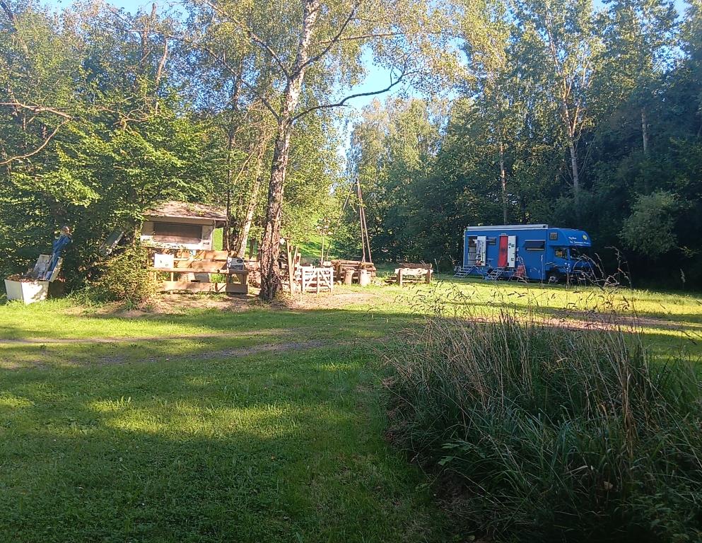 Der Stellplatz in Großalmerode ist eine recht geräumige Wiese direkt an dem kleinen Bächlein. Leider kommt man da aber nicht ran. Ver- und Entsorgung sind auch vorhanden. Und ein bisschen Schatten ist auch zu finden. Aber hier ist der Boden doch noch feucht und weich.