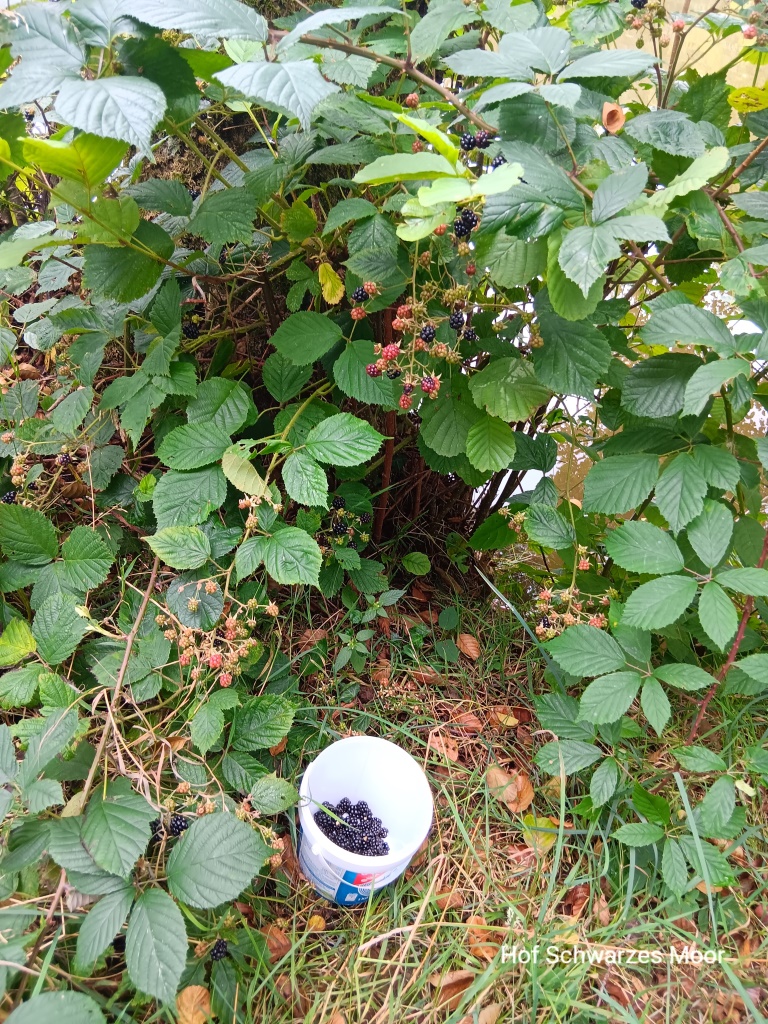 Auf dem Rückweg pflücke ich dann noch zwei 500g Joghurtbecher voll mit wilden Brombeeren, die ich dann noch einfriere.