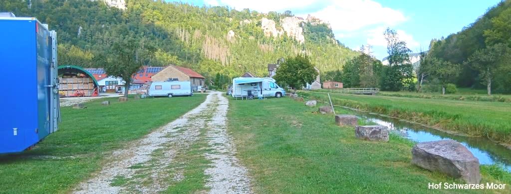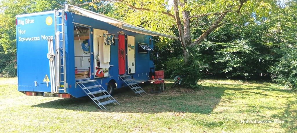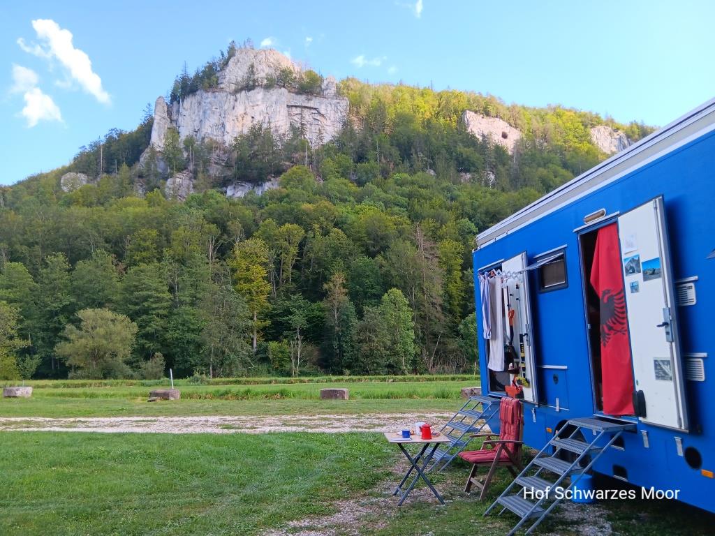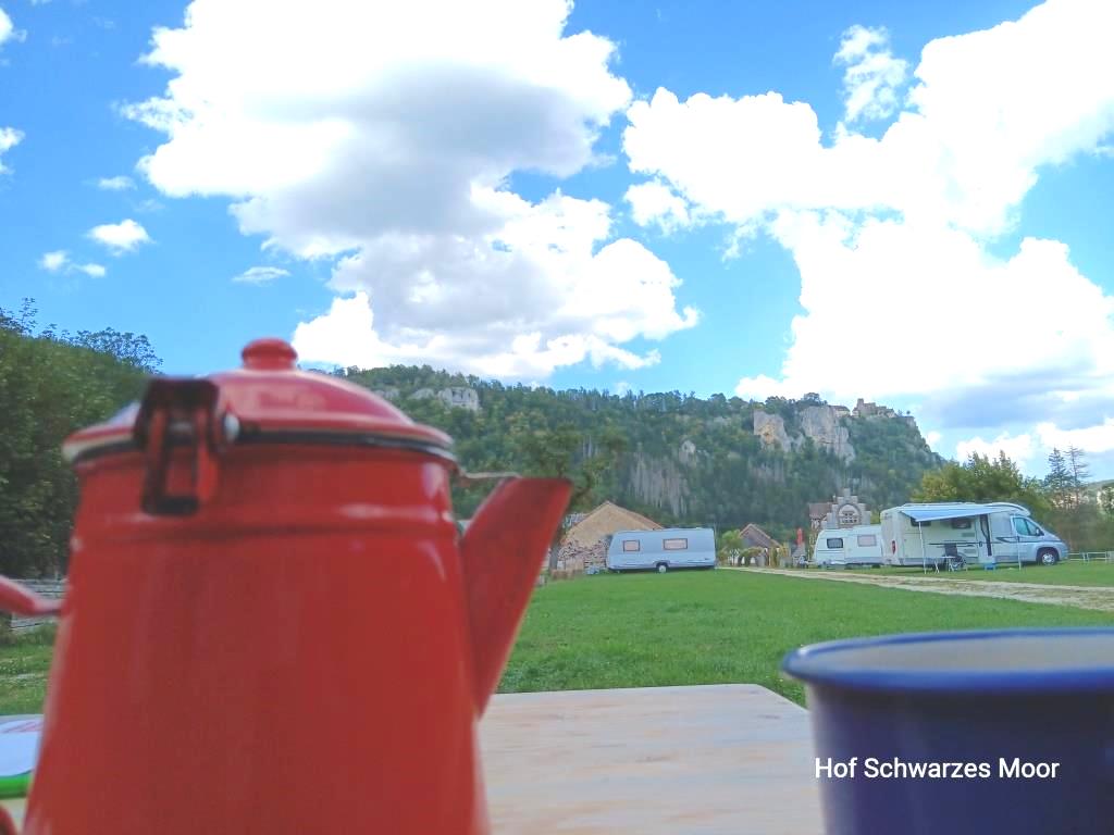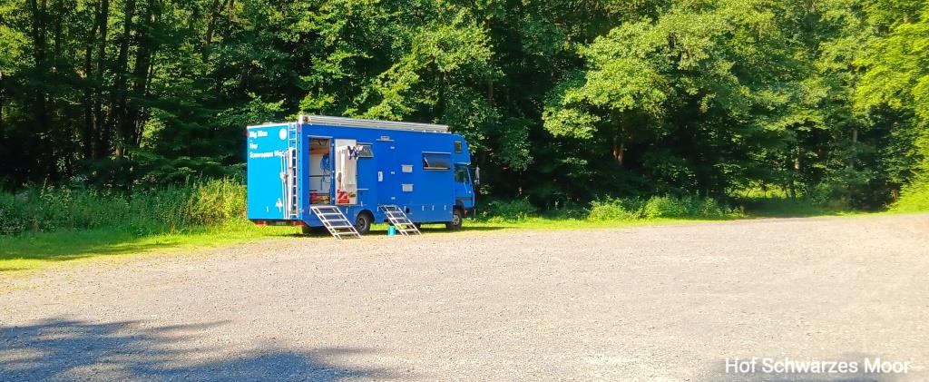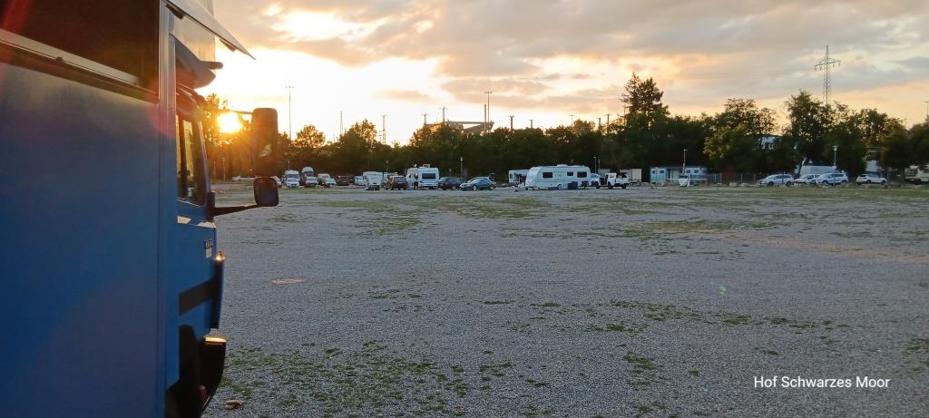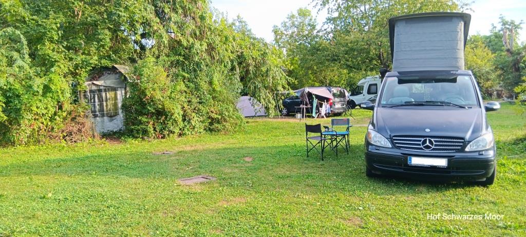 Zurück am Auto quäle ich dann noch einmal Google Maps und finde in vier Kilometer Entfernung einen Bauernhof, der Stellplätze anbietet. Mit einem Standard im Kopf, wie wir ihn auf unserem Hof selbst anbieten bin ich guten Mutes. Aber leider nicht lange. Hier stehe ich auf einer Wiese gerade dreimal so groß wie Big Blue (auf diesen drei Stellplätzen glücklicher weise aber alleine), die zwischen Landesstraße und B3 eingeklemmt ist und wiederum keinen Schatten bietet. Aber zum nochmaligen Stellungswechsel ist es mir schon zu spät und ich habe dazu auch keine Lust.