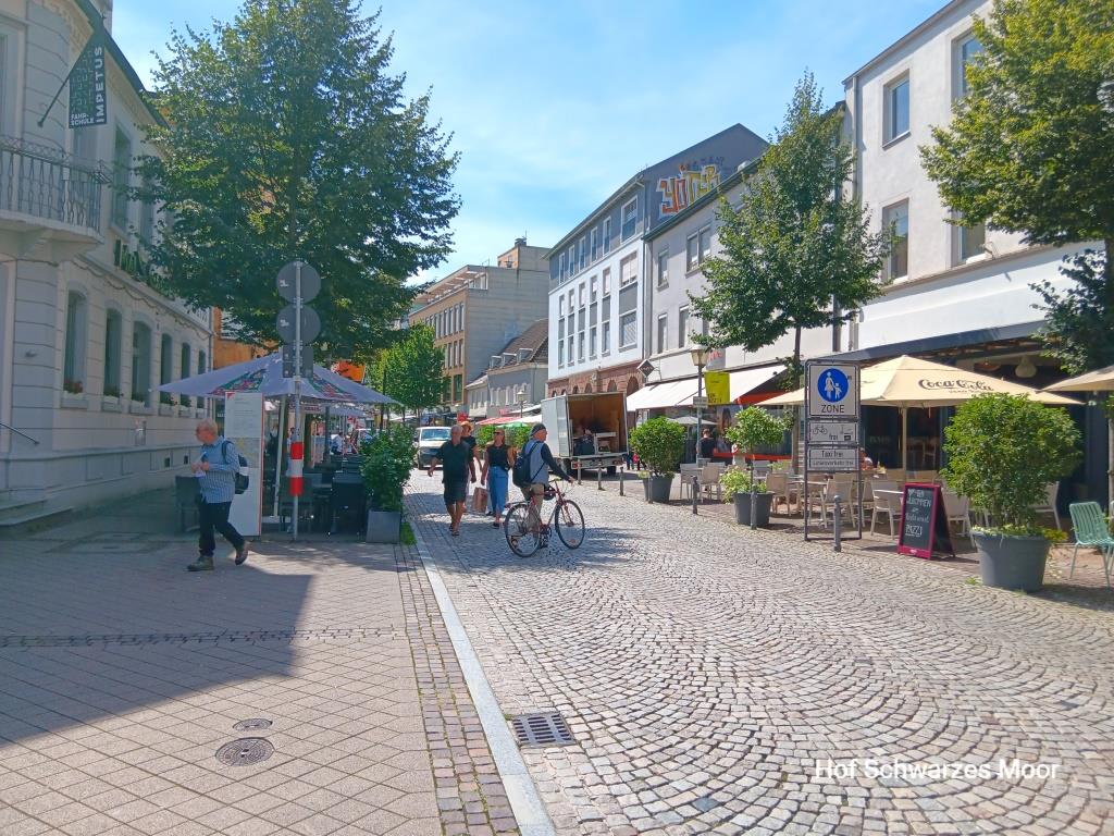 In dieser, eher als klein zu bezeichnenden, Fußgängerzone vier – in Zahlen „4“ – TEDi-Läden. Diese werden zu großen Teilen von Holländern frequentiert. Kleiner Grenzverkehr. Und diese Grabbelläden, genauso wie die großen Lebensmittelmärkte im Stadtrandgebiet sind auf diese Kundschaft echt eingeschossen. Beschriftungen und Werbeslogans zu großen Teilen in Holländisch.