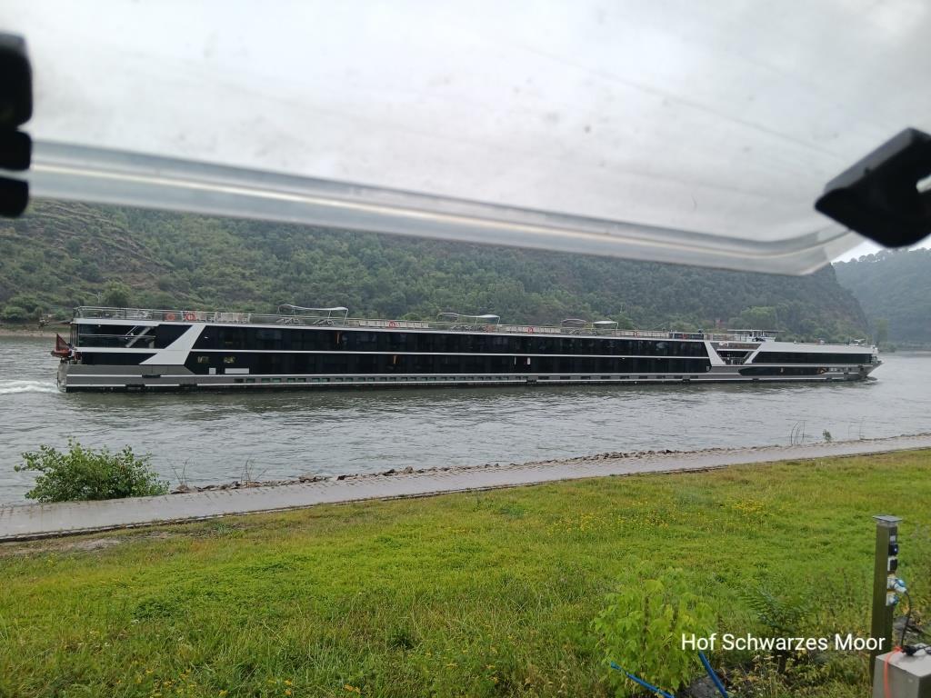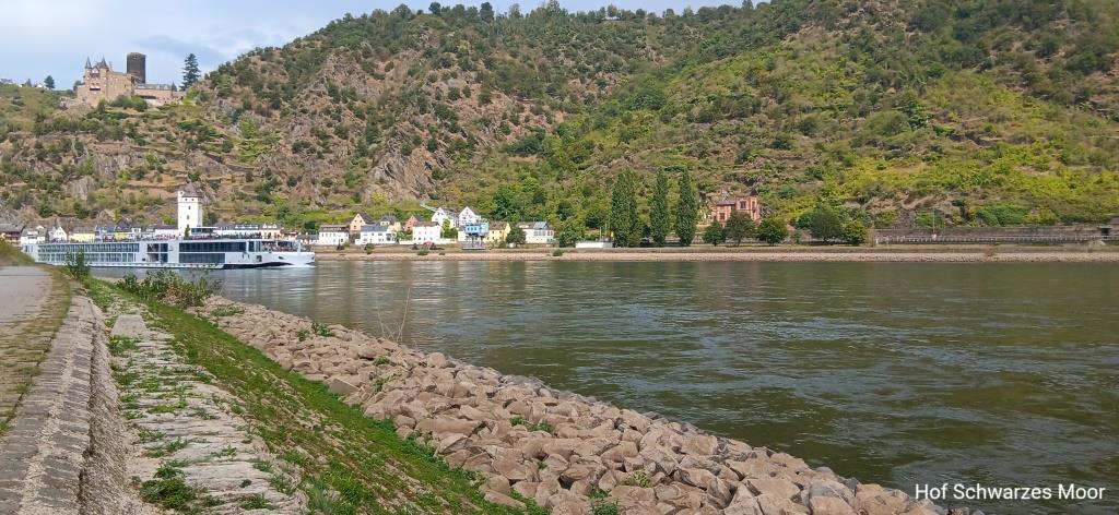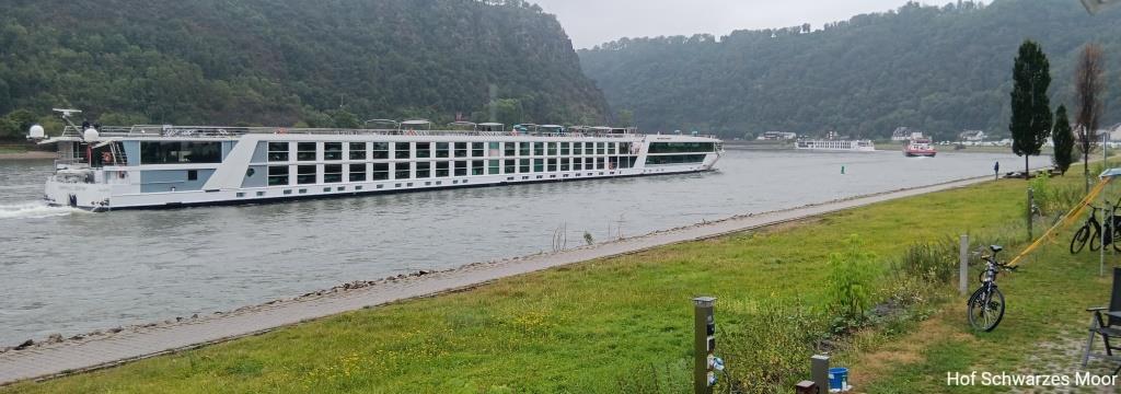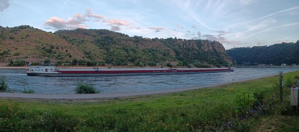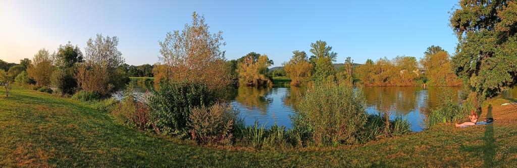 Schon direkt nach dem Frühstück bin ich reif für eine Badepause. Laut Wetterbericht liegt eine Nacht mit tropischen Temperaturen hinter mir: Beim ersten Aufwachen heute Morgen sind es schon – oder noch – 22°C. Und das Wetter schlägt wohl um. Westlich über dem Rhein hängen dunkle Wolken, östlich ist blauer Himmel mit kleinen Wölkchen zu sehen. Und ich mal wieder direkt an der Wetterscheide.