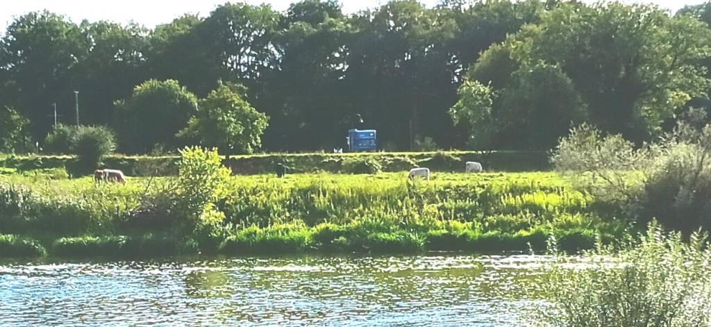 Die Radwege entlang der Ems sind schön angelegt und führen durch sehenswerte Landschaft. Sie sind mit feinem Splitt gedeckt. Das macht das Treten ein bisschen anstrengend. Da die Ems hier mächtig kurvenreich ist, entfernen sich die Radwege leider häufig vom Flusslauf. Das ist schade. Denn durch Felder – mit viel Maisanbau – kann ich auch woanders radeln, wenn ich immer nur auf grüne Mauern schauen will.