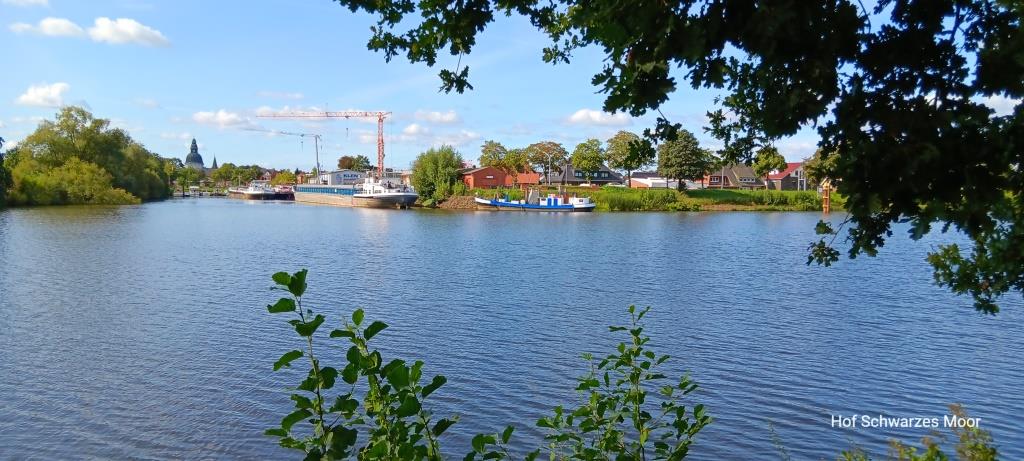 Heute starte ich den Tag mit der Erkundung der anderen Ems Seite – natürlich per Rad. Ein sehr schöner (Rad-) Wanderweg verläuft nahezu ständig am Flussufer entlang. Auch hier befindet sich noch ein alter Ems Arm in dem eine Marina und eine Werft für die Berufsschifffahrt angesiedelt.