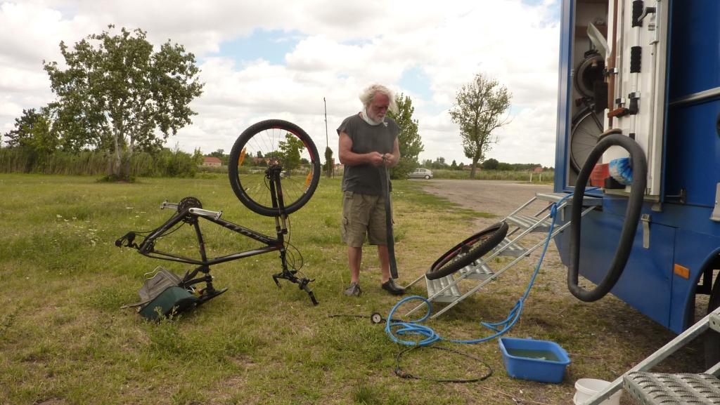 Wir starten zu unserer Seeumrundung mit Verspätung. Mein Fahrradhinterreifen ist mal wieder platt. Also erst einmal Reparieren. Dieses Mal die einfache Tour. Den defekten Schlauch raus, über den Haken „Muss mal gemacht werden!“ gehängt.