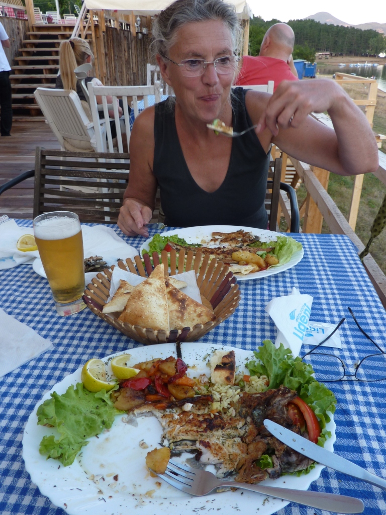 Heute Abend, die Treppe ist fertig, gehen wir im Restaurant essen. Einen kosovarischen Salat vorweg und dann gegrillte Forelle aus dem See als Hauptspeise. Die Luft hat sich abgekühlt und auf der Terrasse über dem See ist genau die Stimmung, die uns diesen Abend unvergesslich werden lässt.