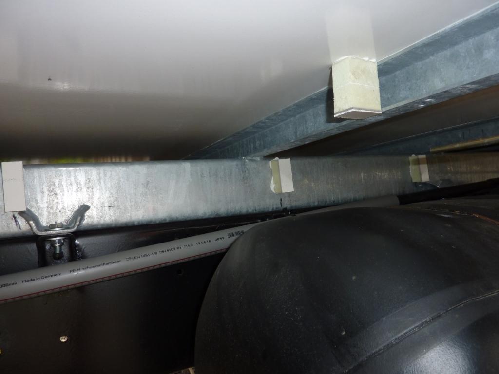 Und als letztes habe ich am Hilfsrahmen aus GFK-Plattenresten geschnittene Streifen angeklebt. Unter der Oberfläche ist ein 2 mm dickes Aluminiumblech eingepresst. Hier will ich dann die Halteschellen für die Gassleitungen festschrauben. Die Klebenaht muss aber gut abbinden. Dann hält das wie Gift.