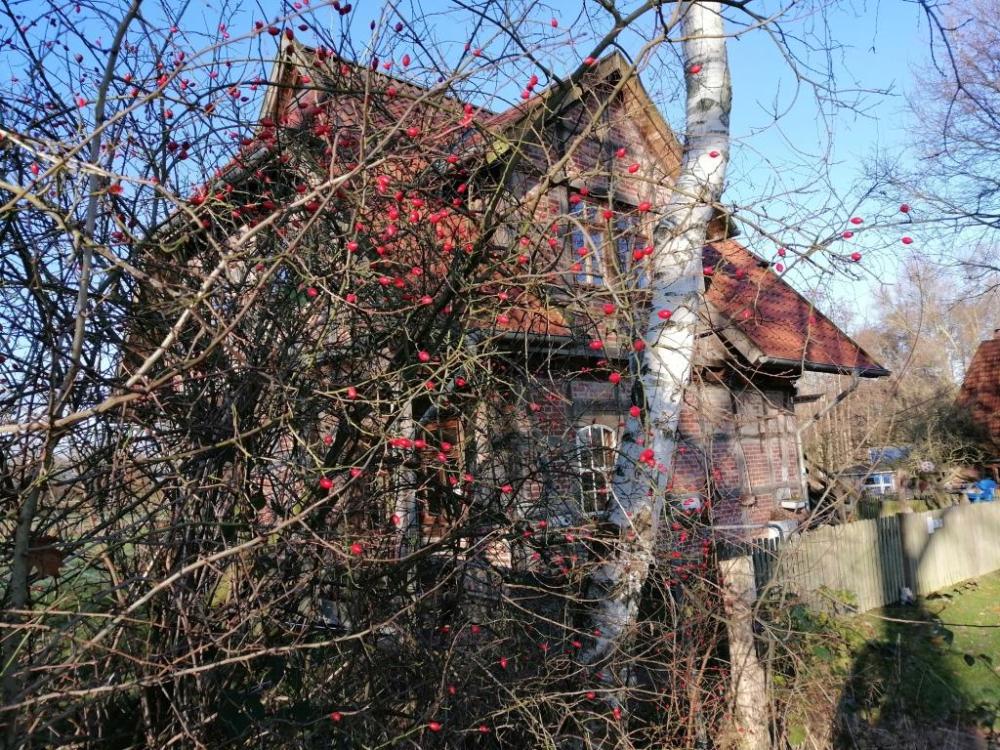 Reizvoll steht unser ehemaliges „Betriebsgebäude“ im Außenbereich direkt am Rand unserer Ländereien, auf denen früher unsere Heidschnuckenherde lebte.