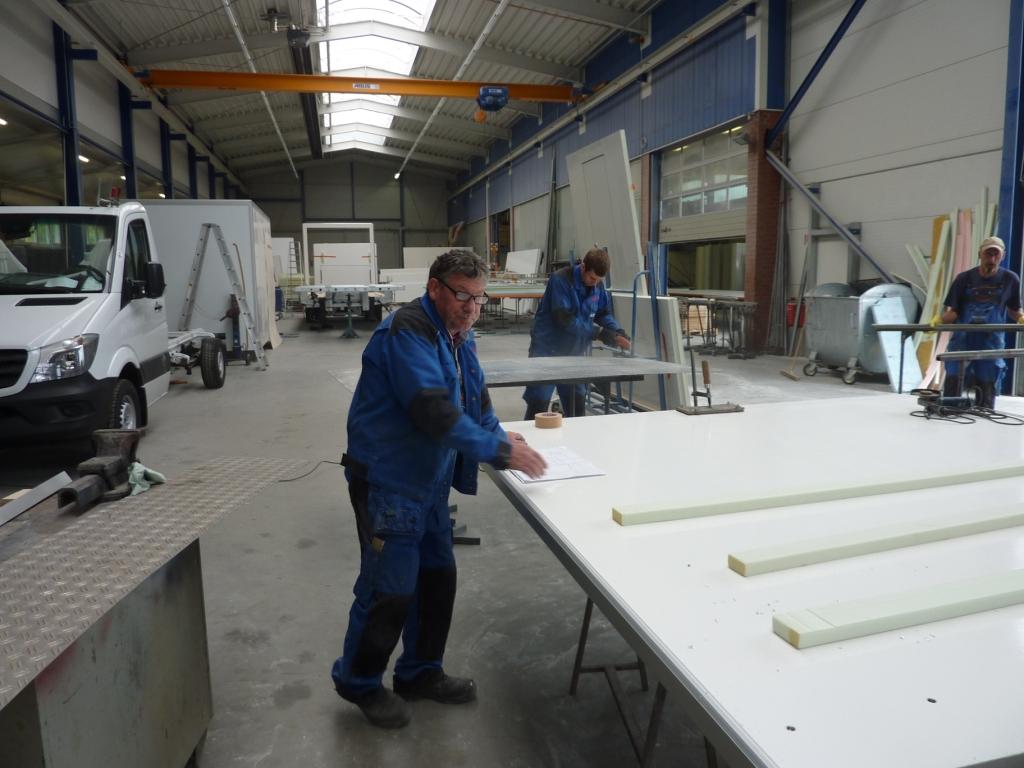 Leider waren so spektakuläre Sachen, wie große Wände mit dem Deckenkran einheben gerade nicht auf dem Plan. Aber ich konnte mir in Ruhe mal so ansehen, wie die hier so arbeiten. Eine für unsere Verhältnisse recht große Halle, in der drei oder vier Gruppen an ihren Projekten arbeiten: Ein Promotionauflieger, ein Koffer (ich weiß nicht wofür), ein Ding was noch nicht zu erkennen war und unser Aufbau für Big Blue. Hier arbeitet Günter mit seinem Kollegen und einem Praktikanten, der sich mit Hoffnung auf eine Einstellung vorstellen möchte.