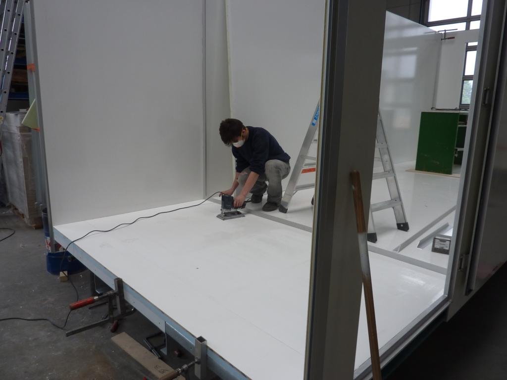 Anschließend hilft er den beiden Anderen beim Verlegen des Aluminiumbleches auf dem Fußboden der Werkstatt und dem Anpassen der Werkbank. Diese muß platziert werden, bevor die Heck- und Trennwand eingebaut werden, denn anschließend würde man den Werkzeugtisch nicht mehr rein bekommen. bleche zuschneiden und die Unterseite mit Primer bestreichen, Boden anschleifen und mit Reiniger von Fettresten säubern dann und verkleben. Zum Beschweren eine Palette mit vielen zehn Kilo Farbeimern heranholen.