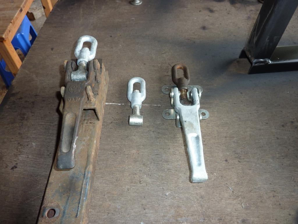 Das Zusammenschweißen von den Stützprofilen war noch recht einfach. Ein U-Eisen und oben ein Vierkantrohr. Das Maßnehmen war schon nicht mehr so einfach. Denn wir haben hier keine wirklich ebene Fläche. So ist der Rahmen immer etwas verdreht. Und neue Spanner brauche ich, denn die alten sind so verscheißt, dass sie nicht demontierbar sind. Unser örtlicher Landmaschinen Schlosser Böse ist dafür immer eine gute Adresse. Kurz mal mit Cord durch den Computer geguckt und schon hatten wir, was wir brauchen. Am nächsten Tag war das Zeug auch schon da. Die Außenmaße stimmen. Aber die Gewindestange zum Nachstellen war hier viel kürzer und auch nicht in Feingewinde ausgelegt. Der Griff am alten Spanner war noch geschmiedet, der Neue ist aus Guss. Aber das Letztere ist nicht so wichtig. Aber die Gewindestange muss ich umbauen. Denn mit diesen Spannern wird nicht nur die Fahrerkabine festgesetzt, sie wird hinten auch so weit runter gezogen, dass die Rückwand genau senkrecht zum Rahmen und damit parallel zur Vorderwand des Aufbaus steht. Sonst regnet es durch die Dichtung der Durchgangs rein.