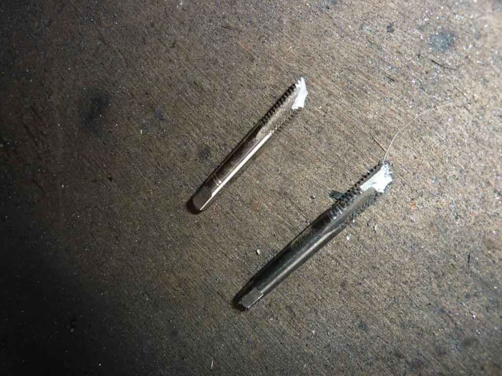 Für die Kunststoffklötze muss ich noch Gewinde in das Auflager schneiden. Das war noch nie mein Ding. Zwei Gewindebohrer brechen ab. Mist. Und das sind ganz besonders gute von unserem Nachbarn André.