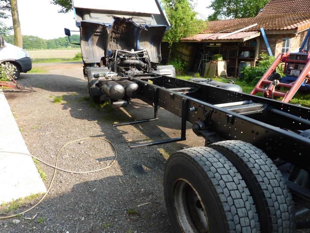 Ich muss mich jetzt darauf einstellen, dass ich innerhalb von zwei Wochen den Hauptrahmen fertig bekomme: An einigen Stellen entrosten und lackieren. Den Lufttank für die Werkstatt nach innen in den Rahmen verlegen um außen mehr Platz für Unterflurkästen, Reservereifen und einen größerer Tank zu erhalten.