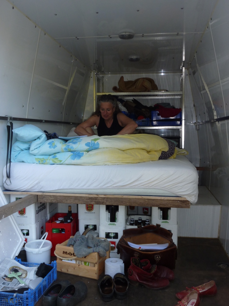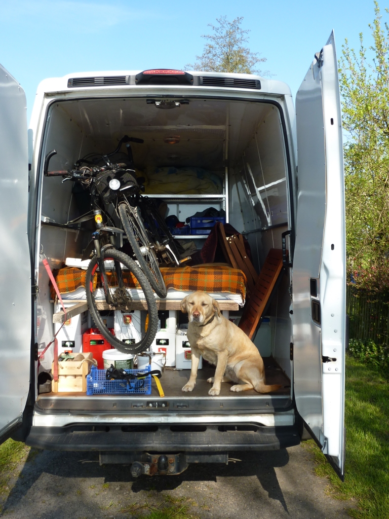 Zum Glück haben wir noch den Lieferwagen aus der Zeit unserer Heidschnuckenschäferei. Da ein paar Matratzen rein und los geht’s. Es wird dann aber doch noch etwas komfortabler: Wir haben gerade 30 Kisten Neumarkter Lammsbräu bei Ernst Röhrs (der Biolandbauer unseres Vertrauens) geholt. Da Heidis Mercedes mal wieder kaputt ist und Heidi daher mit unserem Lieferwagen zur Schule gefahren ist, haben wir das Bier immer noch nicht ausgeladen. Das kommt meiner Faulheit entgegen. Die Bierkisten, immer zwei übereinander im Fahrzeug verteilt, dann eine Holzplatte, (ein Überbleibsel der alten Seitenwand von Big Blue auf Maß gesägt (140 x 200) auf die Bierkisten gelegt und darauf unsere Matratze aus unserem zuhause Bett gelegt, und es ist schon recht gut. Ein Bett auf einer stabilen Basis.